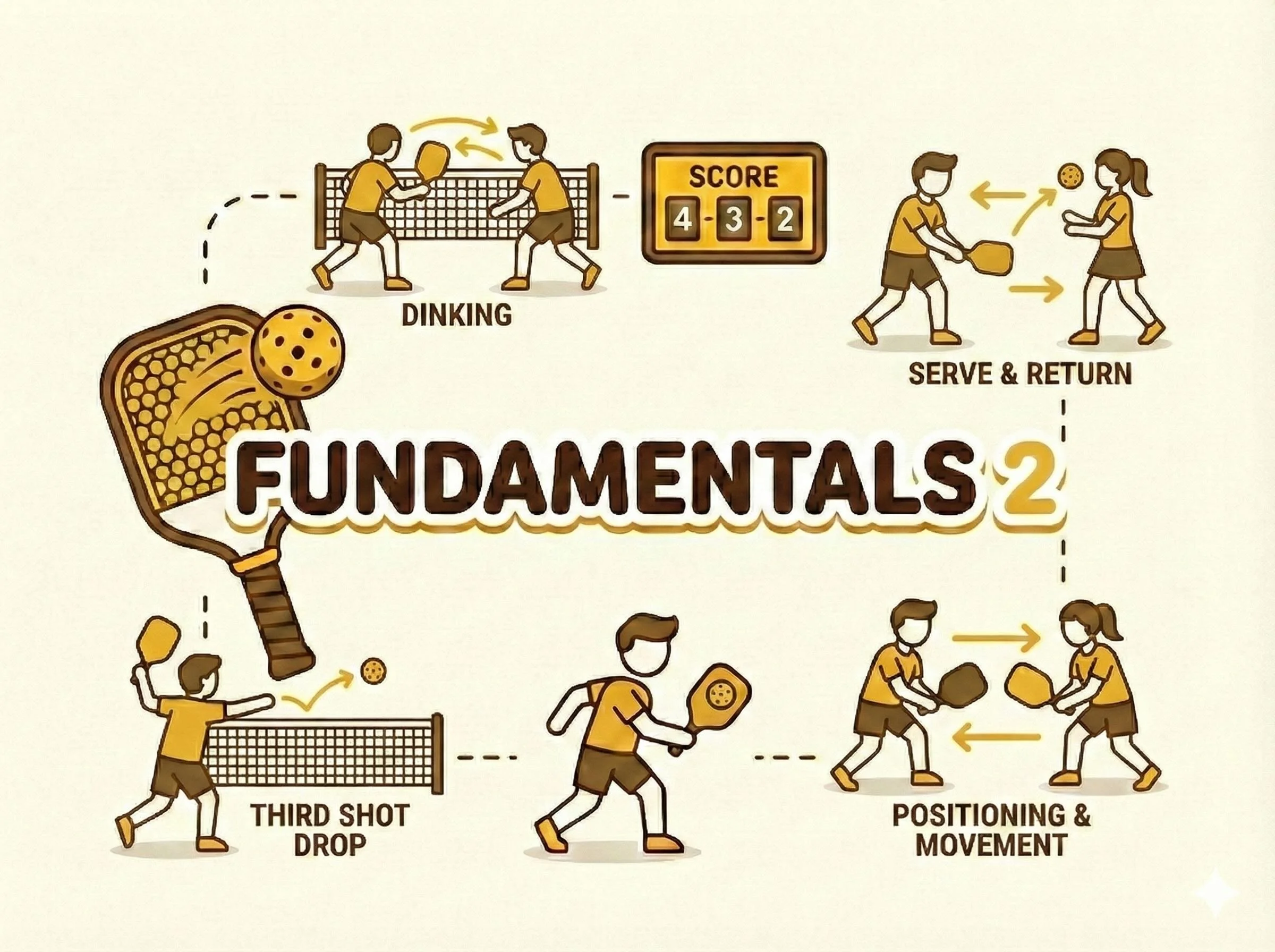 The Play! Pickle Mastery Program is our complete, skill-based pathway for adults who want to play pickleball with confidence. You’ll begin with 2 Fundamentals Courses to lock in the essentials, then choose any of the 3 Skill Courses in any order, so you can train around your schedule and focus on the areas you want most.